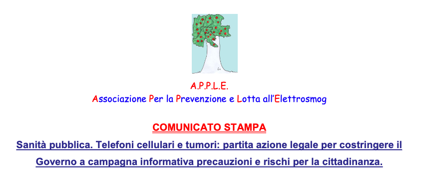 Lo scorso mese di marzo l’Associazione A.P.P.L.E. ed il Sig. Marcolini (sentenza di Brescia) hanno lanciato una causa, senza precedenti per il nostro paese: chiedono al TAR Lazio di ordinare al Ministero della Salute e al Governo l’effettuazione immediata di una campagna di informazione pubblica su scala nazionale sui rischi di insorgenza di tumori per l’utilizzo dei telefoni cellulari, e sulle modalità da attuare per annullare o ridurre l’esposizione. Nel corso della prima udienza sono intervenuti “ad adiuvandum” il CODACONS e MEDICINA DEMOCRATICA. Contro di noi è intervenuta l’ASSOTELECOMUNICAZIONI che riunisce gestori delle reti e produttori (http://www.asstel.it/gli-associati/).